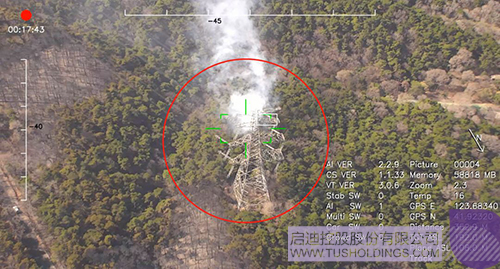 沈陽棋盤山火場,3V復(fù)合翼無人機(jī)搭載三軸30倍光電吊艙巡查到一個(gè)火點(diǎn)已經(jīng)威脅到高壓線的安全