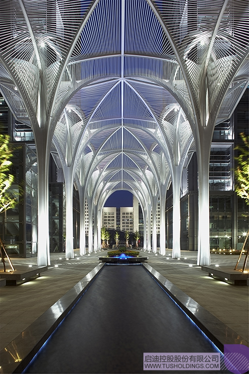 分列的四塔間隙為城市道路通向園區(qū)中心綠地打開(kāi)了一條綠色通廊,中心是12顆參天鋼樹(shù),形成灰空間的限定,與二層平臺(tái)自然的樹(shù)木共同營(yíng)造出積極的公共交往空間。“樹(shù)影婆娑”下是綠意盎然的休閑廣場(chǎng),展現(xiàn)人與自然共生共融的景象。建筑首層斜插入地下的草坪,標(biāo)準(zhǔn)層四角的綠色陽(yáng)臺(tái)和頂層白色膜傘的屋頂花園無(wú)不體現(xiàn)了人性化、生態(tài)化的現(xiàn)代商務(wù)辦公理念。