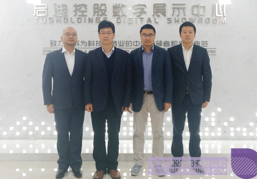 房漢廷副社長(左二)、劉峰總編輯(右二)座談會(huì)后參觀考察啟迪控股數(shù)字展廳