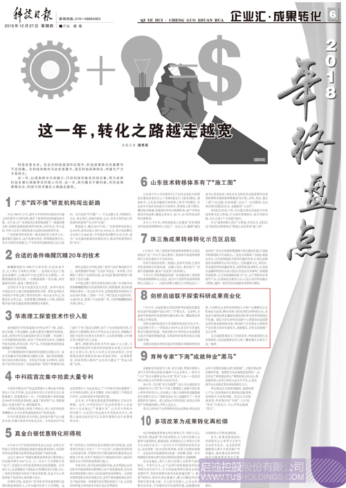 12月27日,科技日?qǐng)?bào)刊文《這一年,轉(zhuǎn)化之路越走越寬》,文中提到:科技改變未來。在邁向科技強(qiáng)國(guó)的征程中,科技成果轉(zhuǎn)化的重要性不言而喻。在科技創(chuàng)新的馬拉松競(jìng)賽中,落實(shí)科技成果轉(zhuǎn)化,對(duì)接生產(chǎn)力才是終點(diǎn)。這一年,以成果轉(zhuǎn)化為突破口,打好科技創(chuàng)新系列組合拳,努力發(fā)揮科技支撐引領(lǐng)新常態(tài)的核心作用;這一年,轉(zhuǎn)化模式不斷創(chuàng)新,利好政策頻頻出臺(tái),科技與經(jīng)濟(jì)融合之路越走越寬。