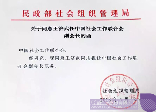 2018年4月,民政部社會組織管理局復(fù)函中國社會工作聯(lián)合會,同意王濟(jì)武同志擔(dān)任中國社會工作聯(lián)合會副會長職務(wù)。此任命經(jīng)中國社會工作聯(lián)合會宮蒲光會長提名,中國社會工作聯(lián)合會黨委會決定。