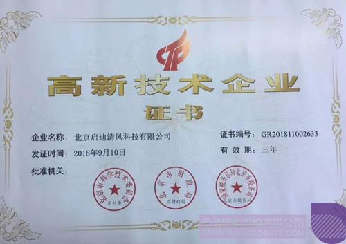 2018年9月,啟迪清風(fēng)榮獲北京市科學(xué)技術(shù)委員會、北京市財(cái)政局、北京市稅務(wù)局頒發(fā)的“高新技術(shù)企業(yè)證書”。