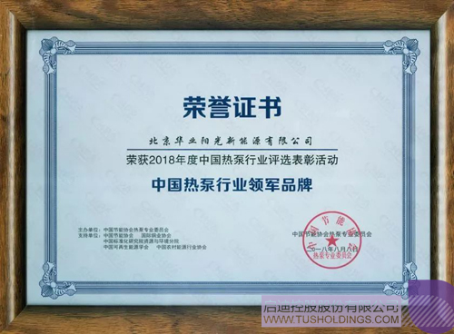 2018年8月,在由中國節(jié)能協(xié)會主辦、中國熱泵產(chǎn)業(yè)聯(lián)盟承辦的2018中國熱泵行業(yè)年會暨第七屆國際空氣源熱泵行業(yè)發(fā)展論壇上,華業(yè)陽光以優(yōu)異的成績及表現(xiàn)榮獲空氣源熱泵行業(yè)最高榮譽(yù)—“中國熱泵行業(yè)領(lǐng)軍品牌”稱號。