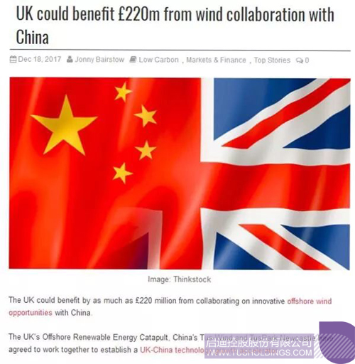 根據英國商務部長GregClark在中國訪問期間簽署的合作協議,啟迪控股將助力山東省落地啟迪海洋科技研究院海上風電示范項目的建設。該示范項目將使用10%到15%的英國技術,可使英國公司獲得最高2.2億英鎊左右的收益。
